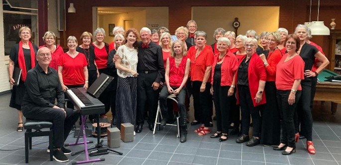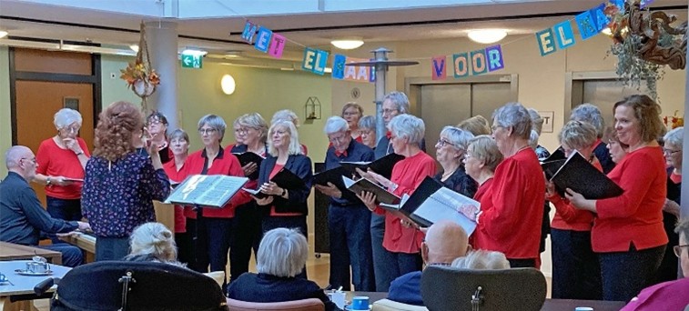Het was alweer jaren geleden dat het koor hier optrad tijdens een Muziekfestival met meerdere activiteiten. Nu mochten we ons ingestudeerde repertoire éxclusief aan alle geduldig wachtende bewoners ten gehore brengen. Één van onze leden had zelfs “eigen publiek” meegenomen, en dus waren er aardig wat toehoorders. Onze dirigent Svetla probeerde al direct op enthousiaste wijze de bewoners mee te nemen in onze zang. Die prettige stemming bij de bewoners was vóór de pauze al enigszins uitgelaten. Bij het deel ná de pauze werd nog duidelijker hoezeer de toehoorders de liedjes én de muzikale ondersteuning van Tjako zéér waardeerden en enkele bewoners zelfs al stukjes meezongen!. In totaal brachten we 14 prachtige nummers ten gehore en van de leiding mochten we gauw weer eens terug komen, en zo eindigden we met een positieve knipoog naar de zomervakantie.